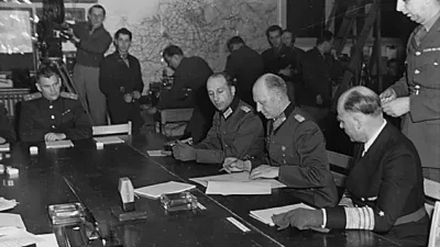 Nemški general Alfred Jodl med podpisovanjem brezpogojne predaje nemške vojske. Na nurnberških procesih so ga spoznali za krivega in ga obsodili na smrt. / Foto: Ameriška kongresna knjižnica