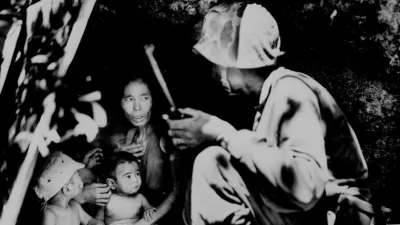 Ameriški vojak je med patruljiranjem na otoku Saipan naletel na družino, ki se je skrivala v improviziranem bivališču. Druga svetovna vojna ni čisto nič prizanesla civilistom in je ena najbolj barbarskih vojn doslej. / Foto: Ameriški nacionalni arhiv
