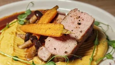 Izginjanje jedi z menija se je nadaljevalo tudi pri glavnih jedeh. Izmed dveh kosov mesa, ki so ju obetali, je zmanjkalo svinjine, k sreči so imeli vsaj teletino (26 evrov), ki jo rožnato spečejo in bogato obložijo s pirejem buče, pečenim krompirjem, gobicami in sirom. Manj težav pri naročanju je, če izberete burger. Vzeli smo klasiko s polpetom, v katerega meljejo govedino s kmetije Čas, burgerju pa, kot smo pri teh ameriških receptih vajeni, priložijo marsikaj, od pečenega krompirčka do sladkih in pekočih omak. Burger (12 evrov), kakršnih je še drugih tisoč v naših krajih: za okus ne poskrbi ne meso, ne štručka, ampak polivke.