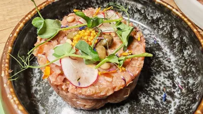 Taljata rečejo ohlajenim rezinam opečene govedine, ki jih kje drugje poimenujejo angleški rostbif, v vsakem primeru pa je bila to sočna hladna predjed, ki ji za volumen dodajo preveč rukole in grahovih poganjkov. Veliko je bilo tudi tatarskega bifteka, začinjenega bolj bogato, kot smo vajeni pri novodobnih mesnih minimalistih, in to nas ni prav nič motilo.