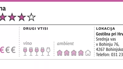 Do Hrvata pelje mestoma celo panoramska, v glavnem pa hudo vijugasta cesta iz doline. Iz celo preveč natančno prenovljene jedilnice je pogled na Vogel in njegove sosednje prijatelje nekaj posebnega, še veliko lepše je poleti na terasi, pod katero šumi rečica Ribnica. Ob prenovi so ohranili šank, čeprav so se za njim nekoč menda skoraj vsak vikend stepli, zdaj pa so domačini, vsaj tiste urice, ki smo jih preživeli v sosednji jedilnici, umirjeno moževali.