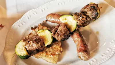Enako ceno ima ombolo – ponujajo tri spodobne izkoščičene svinjske zarebrnice. Meso najraje podložijo s pretlačenim kuhanim in potem še enkrat pečenim krompirjem ter kislim zeljem. Skratka, dve vrsti sijajnega mesa po istrsko, razvrščeni v dve veliki porciji, je mogoče dobiti poceni, in kar je še pomembneje, gre za izvrstne mesnine, ki ne zaostajajo za najboljšo govedino. Govedino, ki smo jo, mimogrede, poskusili v obliki ražnjičev z bučkami.