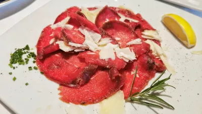 K hrani. Za začetek, pred juhami in toplimi predjedmi, so na debelo, kar je pri nas že kar redkost, narezali goveji karpačo (17 evrov). Presenetljivo obilno sočno mesnino so podprli z ribanim sirom in brez razloga podložili z rukolo. Sodelujeta navaden in popečen kruh.