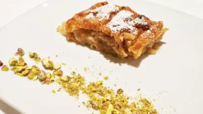 Pri sladicah imajo orjaško verzijo gibanice, tiramisu in panakoto. Naše omizje pa se je lotilo enostavnih domačih palačink z marelično marmelado in pravega jabolčnega štrudla. Za samo štiri evre.