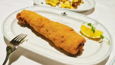 Recept ali način priprave spominja na srbsko Karađorđevo šniclo, a se zdi, da je bil zarolan telečji primerek milo rečeno večji od tistih, ki smo jih pokusili, recimo, v beograjskem Franšu. Pa še razmeroma poceni je za svojih 20 ali celo 25 cm dolžine in pet centimetrov premera. In če pustimo mere – natakarica je zagotovila, da so ga doslej do konca pojedli vsi, ki so ga dobili na krožnik – gre za najboljši ljubljanski zrezek, kar smo jih v naši dolgi karieri pomalicali v Ljubljani.