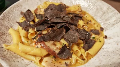 Fuži s škampi, jurčki in črnimi tartufi Foto: Miha First