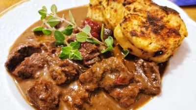 Tretje vino večera, ki so nam ga natočili, je bil refošk iz istrske vinske kleti Rojac. Pokrival pa je dve, obe zelo mesni jedi. Mimogrede – meso v Ivanu pripravljajo v krušni peči, kar mu daje prav poseben pečat. Najprej je prispel tako po okusu kot količini bogat golaž iz kočevskega jelena s krepkimi popečenimi kruhovimi cmoki in sladkimi brusnicami, ki so popestrile klasičen, malce vinski okus golaža.