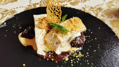 Samo dve sladici sta bili na našo nedeljo na sporedu, obe na visoki ravni. Šlo je lešnikovo zmrzlino, postreženo z angleško in višnjevo kremo, ter brownie z moussom iz bele čokolade, prav tako na višnjevi omaki. Ob nobeni nismo imeli pripomb, nekoliko bolj všečna je bila lešnikova zmrzlina – morda tudi zaradi vročega popoldneva. Mimogrede, sladice niso vključene v prej omenjeni meni, ampak so po dodatnih šest evrov in pol.