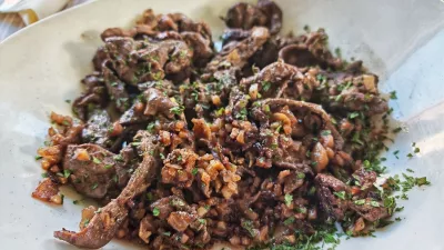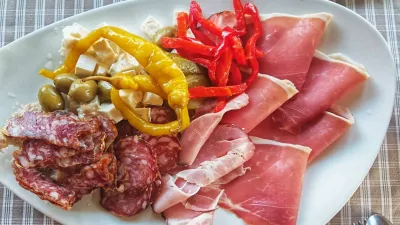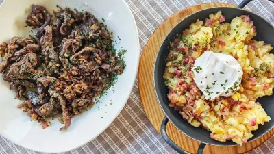 Vemo, da pri Martinu to ni običaj, a naša odprava (tudi) po narezku gostilno pozna – in gladko smo ga naročili, še posebno potem, ko smo izvedeli, da tatarski biftek stane 28 evrov. Narezek je bil osem evrov cenejši, je bil pa domač, lokalno obarvan. No ja, ne povsem. Namesto sira so nam recimo na krožnik postavili feto oziroma nekaj feti podobnega, pršut je bil italijanski. Je to san daniele, smo vprašali. Grem vprašat v kuhinjo, je rekel natakar in se ni več vrnil. So bile pa rezine mehkega pršuta prijazno na debelo narezane, sočna je bila vratovina, zraven sta bili dve suhi salami oziroma salama in želodec, pa še vložena paprika, kisle kumarice in feferoni. Zaseka je bila zelo mesna, bravo, a bi pri podlagi zlahka pogrešali olive, ki so s slanico zalile krožnik in po nepotrebnem namočile mesnine. Kruh je bil izjemen, ampak še enkrat, tako globoko v gorenjskih hribih res nočemo jesti oliv in sira feta.
