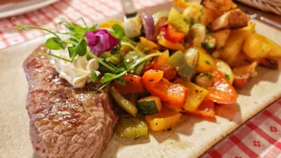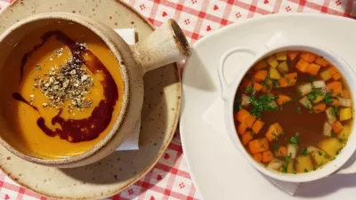 Tretja in zadnja hladna predjed je tatarski biftek za 14,5 evra, mi pa smo že pogledovali proti juham. Tako goveja kot bučna sta bili kar preveč pogumno začinjeni in preslani, bučno so obogatili z bučnim oljem in semeni, v goveji je bila ob rezancih bogata doza gomoljne zelenjave.
