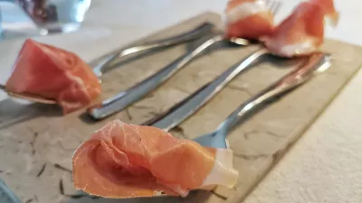 Začeli so s pozdravom iz kuhinje, ki ga zapakirajo v kategorijo pogrinjek/kruh in ga kvartetu, kot je bil naš, zaračunajo 12 evrov. Za ta denar pridejo na mizo kruh, spenjeno maslo s soljo in rezinica Ravbarjevega kraškega pršuta, tako žepna, da se bog usmili. Stvari smo lastnoročno popravili in naročili še porcijo malce bolj sladkega Ščukinega pršuta, porcija za eno osebo stane 17 evrov. Hkrati smo ustvarili še izvrstno okolje za primerjavo pozdravnega pršuta iz Dola pri Vogljah in tekmeca iz Kobjeglave, ki je bil, kot rečeno, slajši in nekoliko temnejši. Pa še več ga je bilo, seveda.