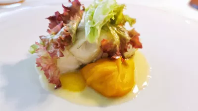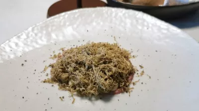 Prva jed, ki sodi v kategorijo hladnih predjedi, so bile opečene in ohlajene rezine teletine z lešnikovo majonezo, fermentiranim črnim orehom in nastrganimi črnimi tartufi. Sestavine so se lepo povezale, a kaj, ko je bilo vsebine na krožniku le za večji grižljaj.