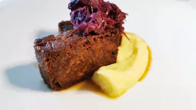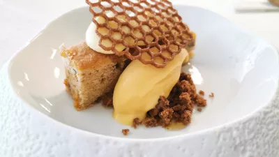 Kot smo že omenili, so nam za glavno jed namenili smuča. Kos fileja je bil skoraj brez avtorskih intervencij, dodali so le bučno kremo in listnato solatko z lešnikovim vinaigrettom. Stran, ki si je namesto ribe izprosila meso, pa je bila deležna nepretresljive popečene kocke jagenjčkove terine, ki so jo pospremili z rdečim zeljem in pirejem s komarčkom in gorčičnimi semeni.