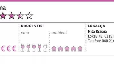 Tudi cena, zajetnih 55 evrov za štiri takšne jedi, je visoka. Primer iz pregovorno predrage Ljubljane: v bistroju Jaz s podpisom Ane Roš štiri jedi stanejo 42 evrov, v visoko rangiranem The Restaurantu pa 25 evrov. Skratka, v Hiši Krasna smo jedli malo in drago.