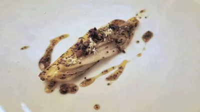 Dišeče vino mojstra, ki je nekoč delal tudi v Sloveniji, se je takoj spoprijelo z domačim mladim kozjim sirom z zelišči, poganjki storžev macesna in pinjolami. Sledil je slanik z jogurtom, zeliščnim oljem, omako belega fižola in kumarami, ki so ga pospremili z grisinom, obarvanim s sipinim črnilom.