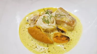 Podpisna, najbolj znana Fuchsova jed je raviol z rumenjakom na kremni špinači, prelit s parmezanovo emulzijo in posut z nastrganimi tartufi iz Périgorda. Najbolj konkretna, gotovo, a tudi najbolj dodelana jed med mnogimi predjedmi. Nato smo hitro spet odpotovali na morje, tokrat z morskim listom, vongolami in klapavicami. Bučni pire in zelena papaja iz bližnjega Stradna dodata v morje nekaj štajerskega, kombinacija pa nedvomno spominja na tajski kari.