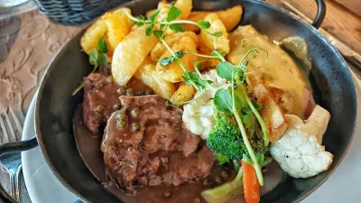 Na mednarodno obarvanem meniju je, kot smo omenili, nekaj lokalnih jedi. Ob gosti, z rezanci, korenjem in koščki govedine bogati goveji juhi ima posebno mesto fazanova juha – s kozicami. Mirno smo jo napadli, čeprav se je zdela prikuha, ocvrtek iz kozic, skoraj preveč neobičajna za te kraje. Pa se je dobro izteklo. Goveja juha je bila solidna, fazanova, ki jo pri mizi natočijo na ocvrtek in jušno zelenjavo, pa celo izjemna.