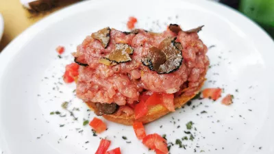 Pri Mauriju imajo slasten narezek za 12 evrov. Spretno so se izognili predragim pršutom in šunkam ter narezali pošteno porcijo klasične mortadele, ostre pikantne salame, suhe, menda kalabrijske salame in mesnate pancete. V spremstvu sta bila sir s čilijem in sladka, res sladka pomarančna mostarda, ki jo je enostavno treba pokusiti s sirom ali kar s kruhom. Če je bilo narezka razmeroma veliko, je bilo bistveno manj tatarskega bifteka s črnimi tartufi in paradižnikom (13 evrov). Ga pa natrgajo, ne meljejo v pašteto, in postrežejo na popečenem kruhu, kar seveda povsem spremeni koncept. Njegov tunin soimenjak nima takšne podlage, je pa okrepljen z avokadom in ikrami postrvi.