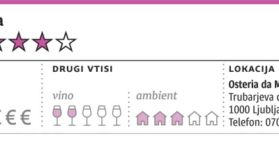 Naj kar takoj povemo, da se bodo morali z vinsko karto začeti bolj resno ukvarjati. Nekaj Mavričeve briške kapljice in nedoločljivo število še nekaterih drugih, bojda naravnih vin, napisanih na tabli, ne more biti rešitev, še posebej ne pri hrani, ki je zrasla z vinom. Morali bi začeti recimo s franciacorto, pa se je hitro videlo, da je edina prava možnost, da večerjo pospremimo z Mavričevo selekcijo chardonnayja. Solidno vino, ki se lahko pomeri z marsikaterim chardonnayjem, a težav z vini to ne bo rešilo. Je pa pomagalo, da smo lažje prebavili prve jedi.