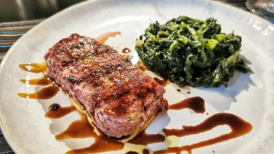 Naj še enkrat poudarimo, da je jedilnik enostaven, na njem sta dve hladni predjedi, dve topli, tri glavne jedi in sladice, na tabli pa je zapisano, da imajo vedno na voljo tudi pršut krminskega mojstra D'Osvalda. Naša ideja je bila, da se zapodimo na jelenov karpačo z gorskim radičem (18 evrov), zraven gre oljčno olje Gradassi, vse skupaj pa počiva ne na rukoli, ampak na motovilcu. Na mizi so beli in črni kruh ter grisini, ob friulanu Gradis'ciutta pa so postregli še zanimive bučkine špagete s pestom in gamberi (14 evrov).