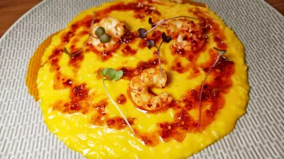 Kljub francosko-italijanskim vplivom v kuhinji smo si tokrat privoščili vino iz španskega Priorata. Perpetual 2019 družine Torres je rdeč silak, ki ga je v Klasu mogoče dobiti razmeroma poceni. Računali smo, da se bo lepo ujel z glavnimi mesnimi jedmi, a so se z njim strinjali že rigatoni, ki jih spremlja zmehčano, neizmerno okusno meso z govejih reber. Simpatično. Bolj eksotična, a nič manj okusna je bila rižota s kremo korenja in ingverja, ki jo na plitvem krožniku popestrijo kozice in nduja. Obe topli predjedi staneta po 24 evrov, lahko pa se dogovorite tudi za manjše in nekoliko cenejše porcije.
