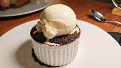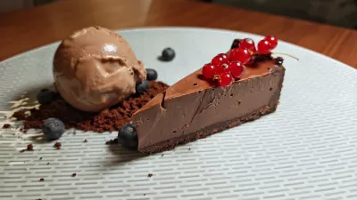 Rib eye in zarebrnica krškopoljca sta bila skupaj s prilogami tudi likovni vrhunec večera, je pa treba reči, da se bomo težko navadili, da je (niti ne zelo prestižna) govedina s ceno 40 evrov v Ljubljani postala nekakšen standard. Ne bomo spet o Italiji, a pred kakim mesecem smo podobno meso jedli praktično pol ceneje, in to v restavraciji, ki se na svetovnih zemljevidih uvršča neprimerno višje kot ljubljanska gostišča. Vseeno, rib eye je bil izvrsten, zloženka jajčevcev, bučk in koromača pa ena najboljših zelenjavnih prilog, ki smo jih pokusili v zadnjem letu. K mesu so v ločenih posodicah priložili še poprovo in vinsko omako ter pire in pečeni krompir, ki sta sodelovala tudi pri slastni zarebrnici krškopoljca s krompirjevo zloženko in kombinacijo rukole ter koromača (28 evrov).
