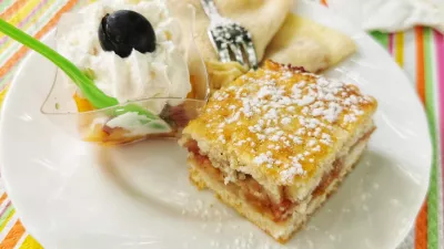 Morate poskusiti, pod kakšno brajdo sedite, je iz hiše prihitel gospodar Božidar z opranim grozdjem. Rdeče debele in sladke jagode niso za vino, jih imajo pa radi otroci in ko dozorijo, jih vedno nekaj prinesejo k mizi. Grozdja je v trenutku zmanjkalo, a je sledilo še nekaj drugih posladkov, recimo breskova pita, pa sadna solata z breskvijo in smetano, za konec pa tudi palačinka s hruškovo marmelado. Porcije sladic niso velike, a se po takšnem kosilu, z dvema glavnima jedema, vsekakor ne gre pritoževati. Še posebej potem, ko ponudijo žganje. Domače, ne premočno, so nas prepričevali, pa vendar se nam je zdelo, da tropinovec ni med najbolj šibkimi.