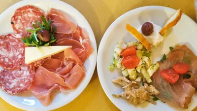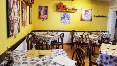 Vseprisotni Dimitrij je tisto soboto v družbi zgolj še ene natakarice stregel kakim desetim mizam. In to razmeroma hitro, saj je jasno, da poskuša trmasti Slovenec kakšno mizo prodati tudi dvakrat. Kdo bi mu zameril, seveda pa lahko, če želite, jeste tudi počasi. Morda s police vzamete celo dobro knjigo, recimo Slovenske ljudske pesmi Zmage Kumer, Vodnik po Dunaju in jasno Prešernove Poezije, ki gredo k proseccu, s katerim smo začeli. Solidno peneče vino so pripeljali iz Trevisa, ni iz steklenice, ampak iz soda in temu primerno poceni. Pri hrani nas je šef takoj opozoril, naj predjedi vzamemo v polovičnih porcijah, ker sicer glavne jedi ne bomo zmogli, in ubogali smo ga.