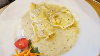 Strategija je enostavna, ko pomalicate raviole, vam ostane toliko omake, ki jo pomažete s kruhom, zato je skoraj zapovedano, da ne smete naročiti cele porcije. Mimogrede, cena sedem evrov je tako nizka, da nižje skoraj ne gre. No, če ne naročite polovične porcije neprekosljivega pastiča s šparglji, ki stane več kot prijaznih šest evrov.