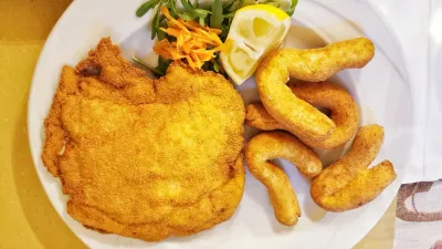 V Ljubljani ni lahko dobiti ljubljanskega zrezka. Drugače je v Italiji, kjer ga, klasičnega, vsaj tako so nam zatrdili, dobite pri Ferlugi. Za 13 evrov smo dobili eno največjih porcij mesa v zadnjem času. Dišeč, s filozofijo zdrave hrane skregan, a hkrati božanski ocvrti svinjski zrezek, radodarno napolnjen s pršutom in sirom. Bog ne daj, da bi namesto pršuta uporabili šunko, je navade nekaterih amaterskih kuharjev komentiral gospodar.