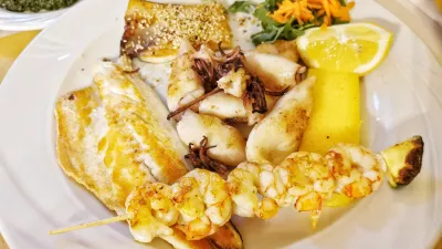 Jasno, pri glavnih jedeh je jedilnik najbolj obsežen, ponujajo celo milanski zrezek, ki stane zgolj devet evrov. Še več pa je morskih prebivalcev na najrazličnejše načine, mi smo se odločili za res soliden morski krožnik. Za 18 evrov se na njem družijo natančno zapečen file brancina, ražnjič s kozicami, zrezek mečarice v sezamu in nepretresljivi kalamari z žara. Za prilogo služi rezina popečene polente, mi pa smo ambiciozno naročili še kremasto špinačo in ocvrte krompirjeve kiflje, ki lahko nepripravljenega človeka dotolčejo.