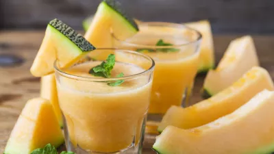 Dobro ohlajeno melono očistimo in narežemo na kocke (en kos pustimo za dekoracijo). Dodamo še sok limete in vse skupaj zmešamo v mešalniku. Smuti nalijemo v kozarce, okrasimo jih s koščki melone in z listki ali vršički mete, po želji pa še s kocko ledu.