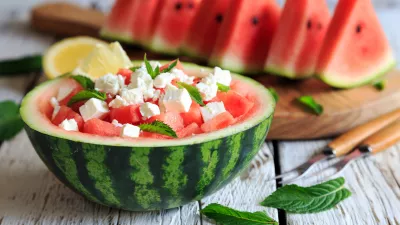 Lubenico prepolovimo po dolžini, da dobimo dve polovici. Z žlico izdolbemo notranjost, tako da pustimo približno 1–2 centimetra mesa ob robu. Meso narežemo na kocke in mu odstranimo peške, čebulo in kumaro narežemo na majhne koščke. V večji skledi zmešamo kocke iz lubenice, feta sir, čebulo, kumaro ter meto, v majhni skodelici pa zmešamo oljčno olje, limonin sok, med, sol in poper. Preliv nežno vmešamo v solato tik pred postrežbo, da feta ne razpade preveč. S solato napolnimo eno polovico izdolbene lubenice in jo okrasimo z dodatnimi lističi mete. Postrežemo jo ohlajeno, po možnosti jo shranimo v hladilnik za vsaj dvajset minut.