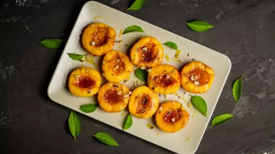 Grilled peaches on the rustic background. Selective focus. / Foto: Mindstyle