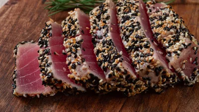 1 Kos tune nežno speremo pod tekočo vodo in dobro osušimo, nato pa vso površino mesa rahlo posolimo in pustimo deset minut, da sol rahlo prodre ter potegne ven odvečno vlago, ki jo ponovno obrišemo s papirnato brisačo. Zatem meso povaljamo v sezamovih semenih, da je vsa površina z njimi lepo prekrita.