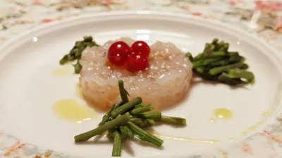 Jedi v Badiju so majhne, kvarnerski škampi kot prva jed še posebej. Surove nasekljajo, obogatijo z oljem in rdečim ribezom ter jim priložijo divje šparglje. Enostavna kombinacija, skoraj sladka in dišeča, kot rojena za spajanje s Coronicovo veliko malvazijo. Jed pa bi lahko bila dvakrat večja.