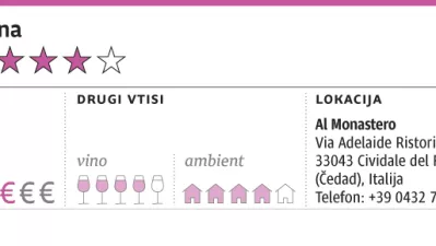 Tokrat se je na sončni konec tedna zdelo vse skupaj tudi malce dražje, hladne predjedi in testenine so od 10 do 15 evrov, je pa res, da glavne jedi še vedno ne presežejo 20 evrov. Največ, ravno 20 evrov, stane hišni tournedos z dimljenim sirom, zelenjavno tortico in vinsko omako. Kakor koli, lačna oseba bo pri Monasteru za večerjo odštela skupno kakšnih 35 evrov, kar je, seveda, predvsem za slovenske in avstrijske goste še vedno zelo sprejemljivo, še posebej ker svoja hišna vina iz La Buse Dal Lôf (po furlansko Volčja luknja) točijo za dva ali tri evre na kozarec, toliko je tudi njihova enostavna hišna peneča rebula, ki smo jo za začetek pili tudi mi; nadaljevali smo z njihovim dišečim tokajem, pardon, friulanom. Hišnega vina na mizo prinesejo kar celo buteljko (16 evrov), nato pa enostavno odštejejo, kolikor gostje spijejo.
