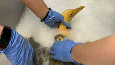 Veterinarska ekipa jo je nežno očistila, čeprav je Vinny »dal vse od sebe«, da jih je med umivanjem pošteno poškropil z mešanico karija in vode. Po umivanju se je pokazalo njegovo pravo perje, ptič pa je po oskrbi začel uspešno okrevati.
