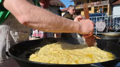 »Včasih je bila na Volarjih gostilna, danes je žal ni več, in tam so pripravljali friko. Večina frik iz okolice Tolmina se pripravlja s krompirjem, oni pa so namesto krompirja v sir zamešali jajca. Tudi danes še naprej ohranjamo tradicijo naše nekdanje gostilničarke. Volarski kmetje so jo včasih pripravljali ob bolj težaških delih, saj je zelo nasitna in kalorična. Jedli so jo, ko so gnali krave v planino ali jeseni odhajali ponje. Danes pa jo pripravljamo ob vaškem prazniku pa tudi sicer se vedno najde priložnost zanjo. Malo frike, malo salame in malo sira – pa je delavska malica,« nam je razložil Jernej Murovec z Volarij. Frika je dovolj nasitna, da ne potrebuje prilog, a za najbolj lačne te niso prepovedane in tako boste lahko videli Tolminca, ki poleg je kruh, polento, bolj redko tudi zelenjavo.