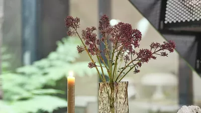 Barve, ki jih navdihuje narava, kot so zeleni in temno vijolični toni, so kombinirane s kovinskimi ter sijočimi elementi, ki prostoru dajejo sodoben, urban značaj. To je še posebej očitno v detajlih, kot so kovinski svečniki in tabureti, ter v manjših kosih pohištva z odsevnimi površinami.