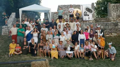 Matej Pšeničnik (prvi z desne), lastnik zemljišča z območjem arheološkega parka, je na Keltski dan praznoval rojstni dan, zato so mu čestitali in se mu zahvalili za gostoljubje. / Foto: ŠUDR