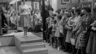 Modna revija sredi Ljubljane v Stritarjevi ulici pred trgovino Tekstil promet septembra 1960 / Foto: Marjan Ciglič, hrani Muzej novejše in sodobne zgodovine Slovenije