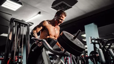 Strong Bodybuilder Doing Heavy Weight Exercise For Back On Machine. T-pull exercise.