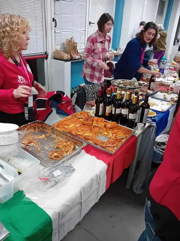 Tradicionalni dogodek svetovnega smučarskega prvenstva novinarjev je tudi nacionalni večer, na katerem vsaka država predstavi svoje nacionalne dobrote. Pri Italijanih ni manjkala lazanja, pri Slovencih pa ne potica. / Foto: Bojan Glavič