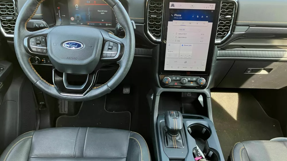 Ranger namreč spada med zajetnejše štirikolesnike na trgu in že s svojo dolžino 5,37 metra vzbuja spoštovanje na vsakem kilometru vožnje. Za kako zajeten avto gre, pa je najopazneje na semaforju, ko se zraven njega ustavi avto povprečnih dimenzij in deluje kot palček. Nekaj posebnega, česar pa se k sreči hitro privadiš, je dostop do potniške kabine z uporabo stopnice. Sedi se namreč resnično visoko, kar pa je super, saj je preglednost izjemna, k čemur prispevajo tudi velike steklene površine, pohvaliti gre še dimenzijsko zajetni zunanji ogledali. Ko voznik enkrat zasede svoje delovno mesto, postane ranger zelo podoben klasičnemu osebnemu avtomobilu. Je namreč sopomenka udobja, ki ga zagotavljajo v usnje oblečeni, električno pomični in ogrevani sedeži ter oprema, ki zajema vse potrebno z vidika udobja in tudi varnosti. Pa najsi gre za aktivni tempomat, ki prepoznava prometne znake, a žal deluje šele nad hitrostjo 20 kilometrov na uro, navigacijo in pametni ključ (za odklepanje in zaklepanje zahteva dotik kljuke). Posebnost opreme wildtrak je v notranjosti velik in pokončno nameščen barvni zaslon na dotik z diagonalo 30,5 centimetra (12 palcev), v zunanjosti pa 18-palčna lita platišča. Alternativa zaslonu je dostop do različnih menijev prek stikal na volanu, klimatsko napravo pa lahko upravljamo tudi s stikali pod zaslonom. Veseli tudi, da sta odlaganju drobnarij namenjena dva zaprta predala in še nekaj odlagalnih mest. So pa pika na i opreme gotovo tudi kamere in senzorji, ki pridejo še kako prav pri parkiranju, saj parkirni prostori tako zunaj kot v garažah ne ustrezajo dimenzijam tega poltovornjaka.