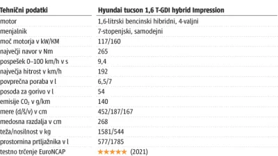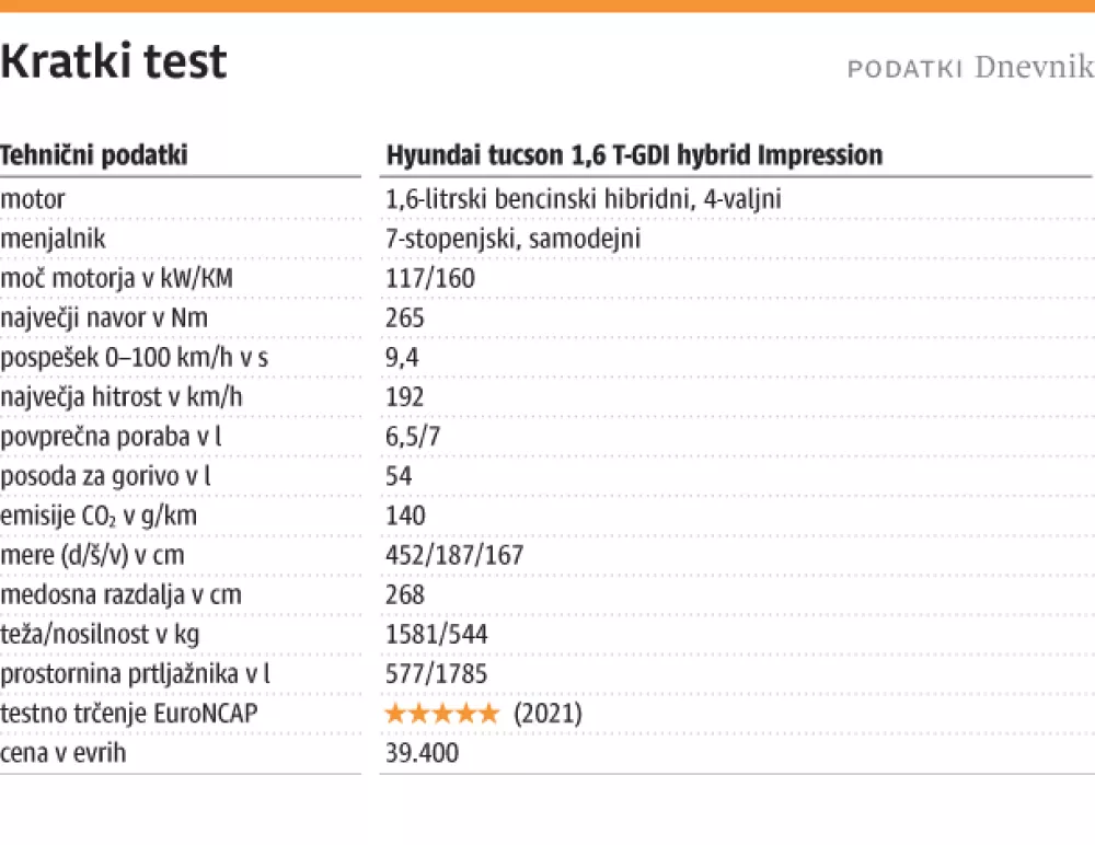 Nič posebnega ni tucson pri porabi. Kljub hibridnemu pogonu in zmerni vožnji je med testom obsegala okroglih sedem litrov, po mestu pa je šlo malenkost več kot šest litrov. Z bolj dinamično vožnjo bi se poraba gotovo povzpela višje. Kljub temu tucson kot družinski avtomobil prepriča, tudi prenova notranjosti mu je dobro dela. Cena ni astronomska. Testni hibridni model s pogonom na dve kolesi in najboljšo opremo impression je stal 39.400 evrov. Osnovnega bencinarja prodajajo za 30.500 evrov. x
