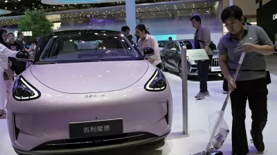 A staff member cleans the floor next to a Geely GEOME Xingyuan electric vehicle (EV), also known as Geely EX2, displayed at the Beijing International Automotive Exhibition, or Auto China, in Beijing, China April 26, 2026. REUTERS/Xiaoyu Yin