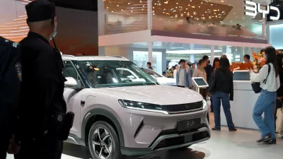 Visitors check a BYD Yuan UP electric vehicle (EV) displayed at the Beijing International Automotive Exhibition, or Auto China, in Beijing, China April 26, 2026. REUTERS/Xiaoyu Yin
