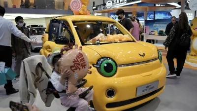 A child poses in front of a Wuling Hongguang MiniEV electric vehicle displayed at the Beijing International Automotive Exhibition, or Auto China, in Beijing, China April 26, 2026. REUTERS/Xiaoyu Yin