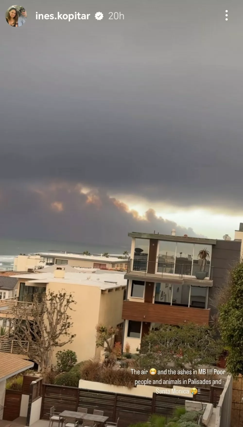 »Zrak in pepel v Malibuju. Ubogi ljudje in živali v Palisadesu in Santa Monici,« je na omrežju Instagram zapisala Ines Kopitar. Anže Kopitar z ženo in otroki živi v v Los Angelesu, dom imajo ob morju. Čeprav njuna hiša ni prav blizu območja, kjer gori, pa očitno tudi njiju skrbijo požari, s katerimi se že dva dni borijo tamkajšnji gasilci in ki so že pogoltnili 2000 hiš.